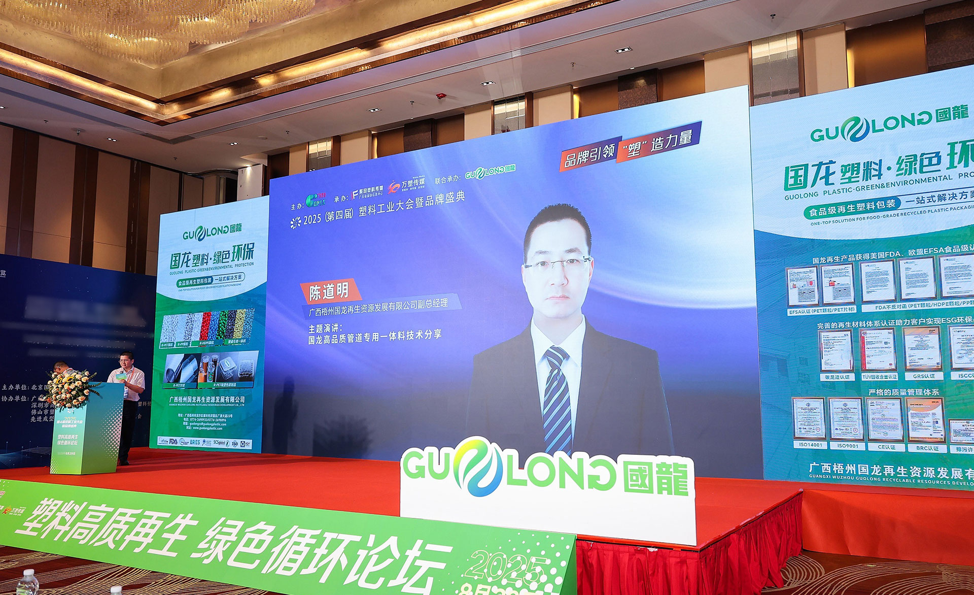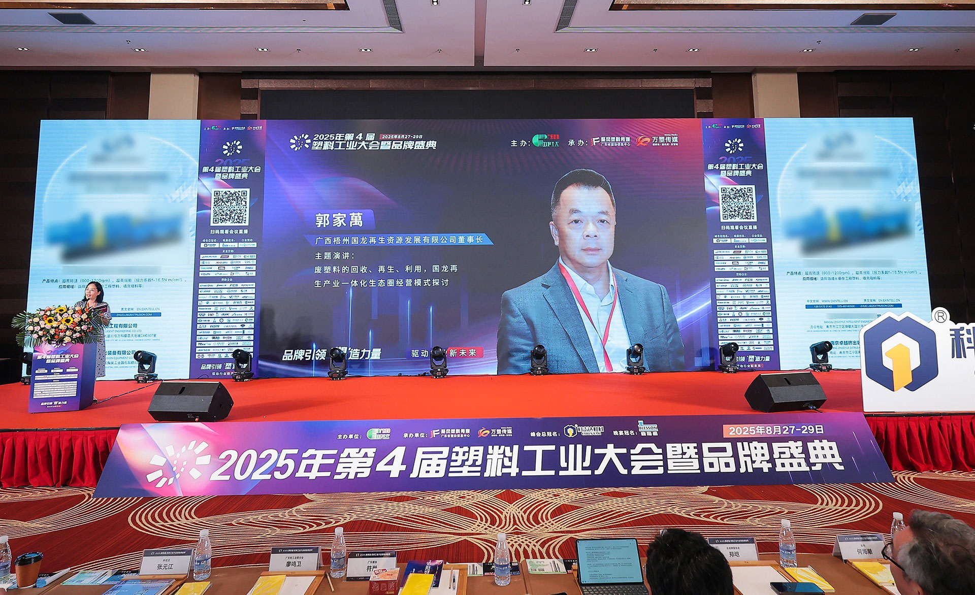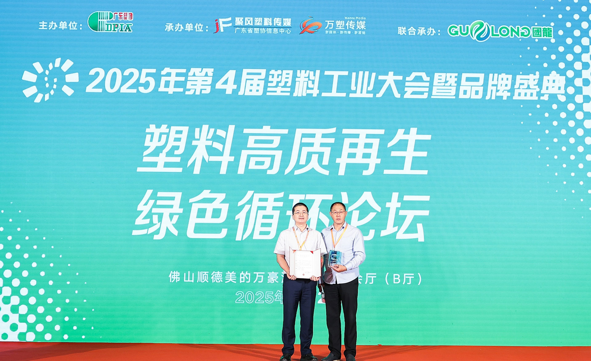 2025年8月27-29日,第四届塑料工业大会暨品牌盛典在佛山盛大举行。广西梧州国龙再生资源发展有限公司(以下简称“国龙再生”)在此次盛典中,不仅荣获“塑料原料/助剂杰出影响力品牌”以及“2025塑业最佳战略合作伙伴”等重磅荣誉,更以联合承办单位的身份深度参与“塑料高质再生·绿色循环论坛”,为塑料工业的高质量发展贡献智慧与力量!