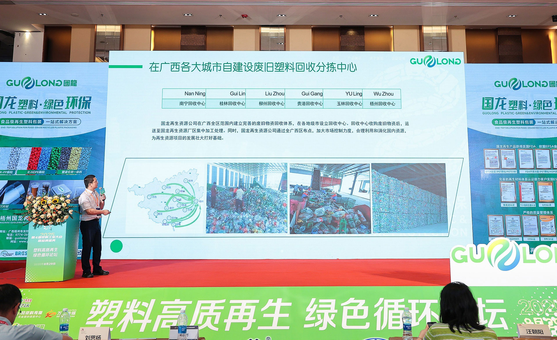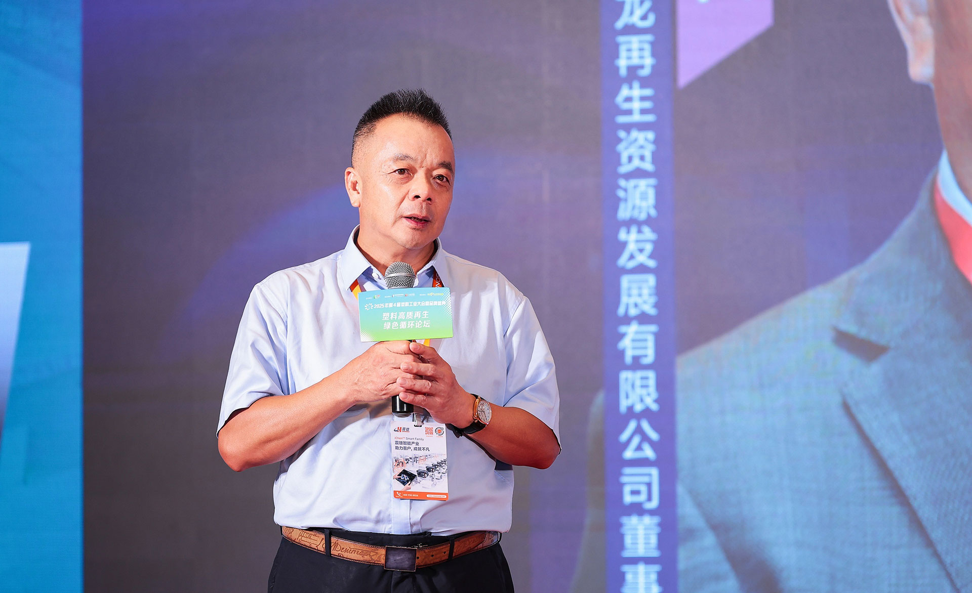 在主论坛环节,国龙郭家万发表了主题演讲《废塑料的回收、再生、利用,国龙再生产业一体化生态圈经营模式探讨》,以废旧塑料的“回收、再生、利用”为核心,从三大维度展开深度分享:我国废旧塑料回收体系构建现状、再生技术突破方向及国龙再生材料创新应用场景,为行业转型升级提供实践范本。